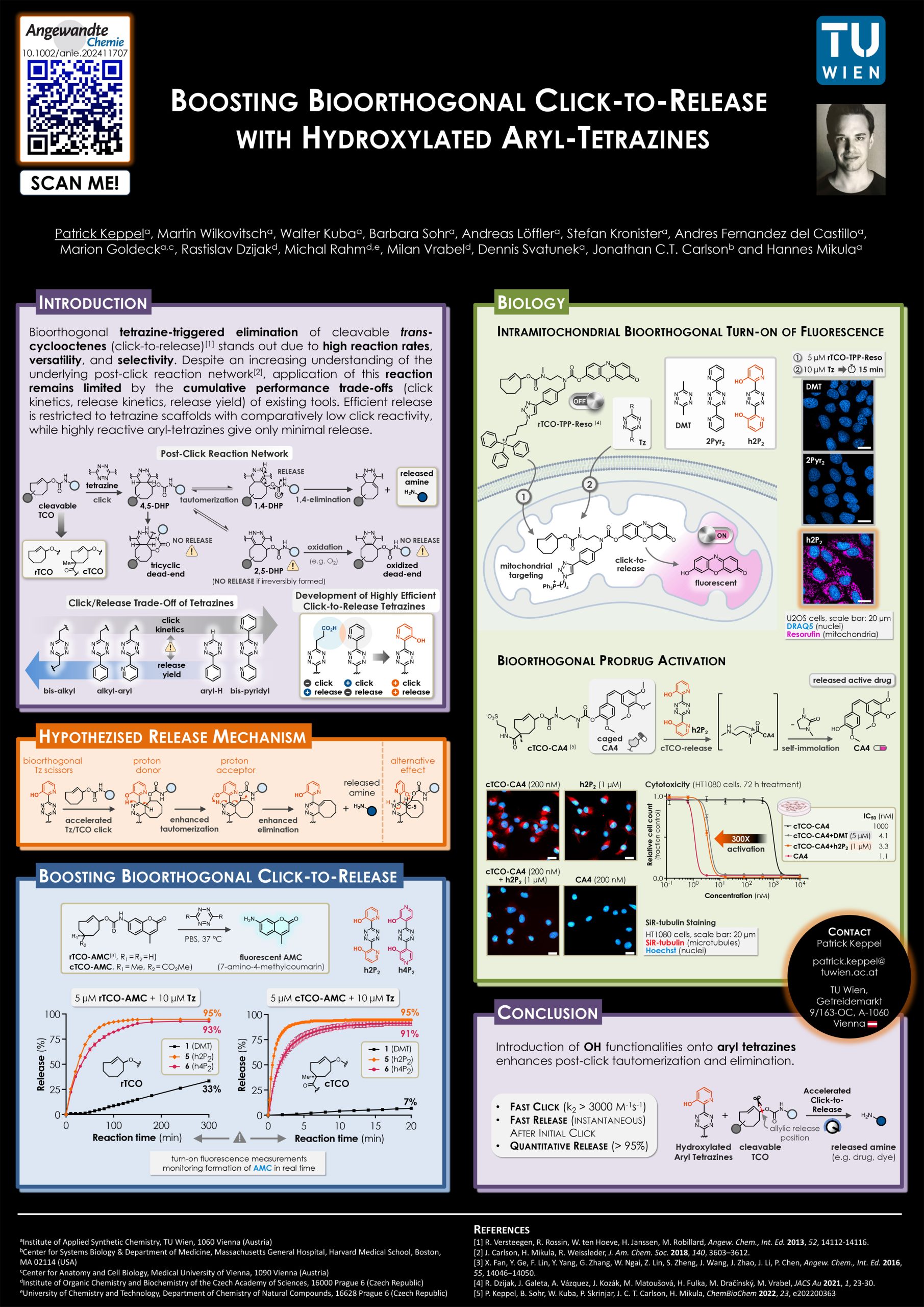 23-09-2024 - P. Keppel*, M. Wilkovitsch, B. Sohr, W. Kuba, A. Löffler, S. Kronister, A. Fernandez del Castillo, M. Goldeck, R. Dzijak, M. Rahm, M. Vrabel, D. Svatunek, J. Carlson, H. MikulaBoosting bioorthogonal click-to-release with hydroxylated aryl-tetrazinesAustrian Chemistry Days - Chemietage